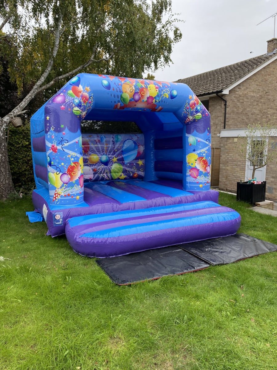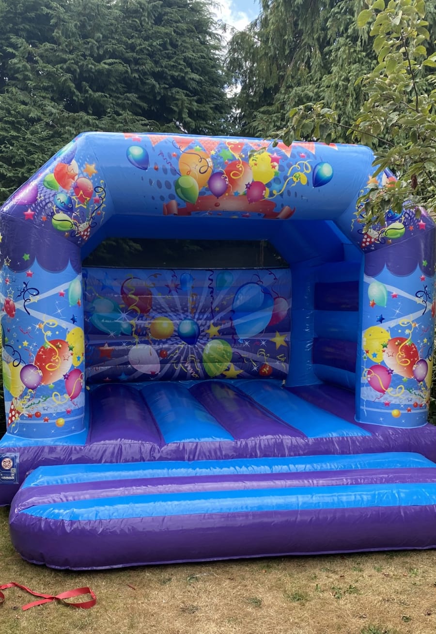 The Party time bouncy castle is new to Sploj and great for celebrations. It is blue, and has party balloons on it. This bouncy castle has a low height roof which means that it fits into a lot of village halls easily. We recommend this inflatable for Kids parties, family Gatherings/ family parties, Weddings, christenings etc. The party time bouncy castle is only suitable for children, unfortunately adults are not allowed unless assisting kids. Sploj are members of BIHA and all inflatables are PIPA tested every year as with UK Law. The party time bouncy castle can be hired to areas in and around Henley on Thames, such as Sonning common, Pangbourne, Goring, Wallingford, Watlington, Reading, High Wycombe, Beaconsfield, Bracknell, Twyford etc. If you do not see your address listed please let us know and we can check if we can deliver to the area. We can hire this inflatable indoors to village halls and sports halls, and outside on areas that can be pegged down such as grass. This inflatable can not be hired to hard standings such as concrete or on fake grass. If you need any further assistance please get in touch with us at 07887353814.